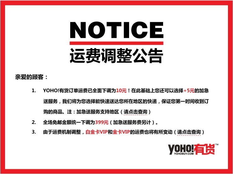 2012年起,YOHO!有貨將原來每單15元的運費下調(diào)至10元,購物滿一定金額可免郵的門檻也由原來的500元下調(diào)至399元。YOHO!有貨物流負(fù)責(zé)人許凱介紹:“在快遞漲聲一片的大環(huán)境下,我們承擔(dān)差價補貼來下調(diào)運費,希望降低用戶潮流網(wǎng)購的門檻。在此基礎(chǔ)上,仍會保持以往優(yōu)質(zhì)的物流服務(wù),運費降了,服務(wù)不能降?!贬槍?jié)假日的購物高峰,YOHO!有貨還推出加急送服務(wù),從訂單審核、物流制單、揀貨包裝、分撿出庫等各環(huán)節(jié)采取優(yōu)先措施,更大程度上滿足不同用戶的物流需求。