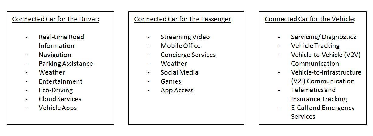 永久性聯(lián)網(wǎng)汽車提供的功能幾乎是無限的。聯(lián)網(wǎng)汽車的功能可分為三大類:針對駕車者、乘客和車輛本身的服務(wù)(圖1)。