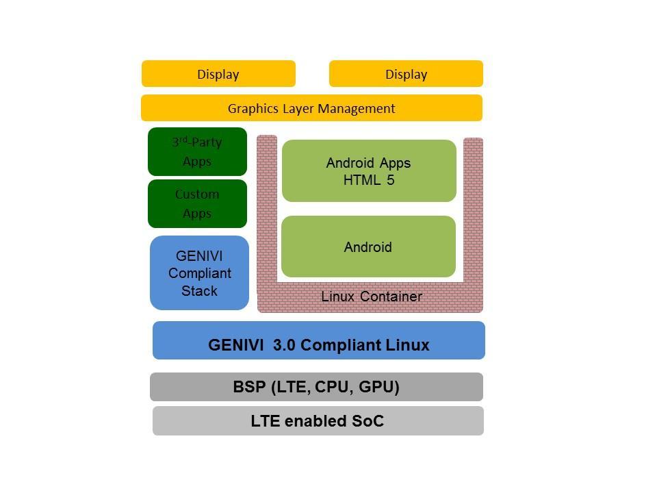 汽車制造商還在想辦法整合車輛功能,其中一個(gè)方法是在一個(gè)硬件平臺上運(yùn)行多種操作系統(tǒng)和服務(wù)。下面的結(jié)構(gòu)顯示,標(biāo)準(zhǔn) GENIVI Linux 平臺頂部裝載了 Linux 容器 (LXC),容器內(nèi)部則能安裝安卓等客戶操作系統(tǒng)。這樣系統(tǒng)用戶能夠安全地下載使用安卓應(yīng)用,核心車載功能也不會受到影響(圖2)。