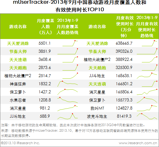從2013年9月移動游戲月度覆蓋人數(shù)和使用時長榜單中可以看到,2013Q3成為騰訊移動游戲的天下,特別是微信平臺對于用戶的吸引巨大,從8月5日《打飛機》和《天天愛消除》在微信5.0 iOS平臺首推,短短兩個月時間已經(jīng)占據(jù)用戶覆蓋和使用時長前列,社交平臺本身的用戶黏性及社交屬性對于輕度游戲用戶的吸引力較強。另外9月Android平臺首發(fā)的《植物大戰(zhàn)僵尸2》也獲得了大量用戶,并且人均使用時長相比其他游戲更高。