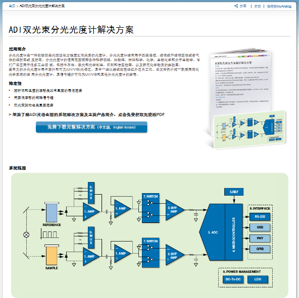 上海2013年11月20日電 /美通社/ -- Analog Devices, Inc.(NASDAQ: ADI),全球領(lǐng)先的高性能信號處理解決方案供應(yīng)商,近日推出了一款雙光束分光光度計(jì)解決方案。作為ADI當(dāng)月精選方案,這款光度計(jì)憑借低功耗、高精度和極度可靠的穩(wěn)定性,可廣泛適用于科研和工業(yè)領(lǐng)域,為工程師解決該類設(shè)計(jì)難題提供了簡單高效的解決方案。