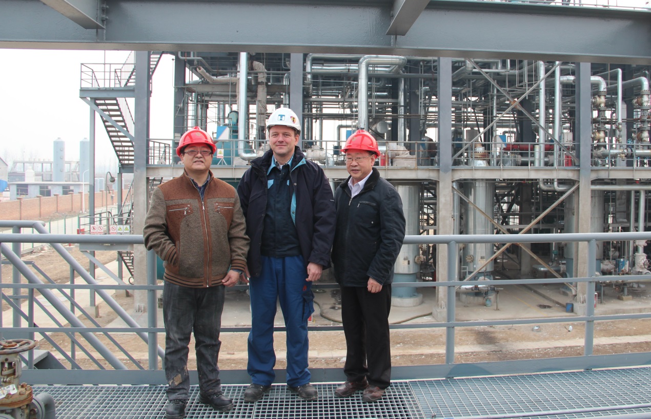 托普索高級(jí)工藝工程師Martin Jensen(中)與中海油山東新能源有限公司總工程師劉國軍(左一)和公司總經(jīng)理姚德彬先生(右一)在甲烷化裝置開車后合影