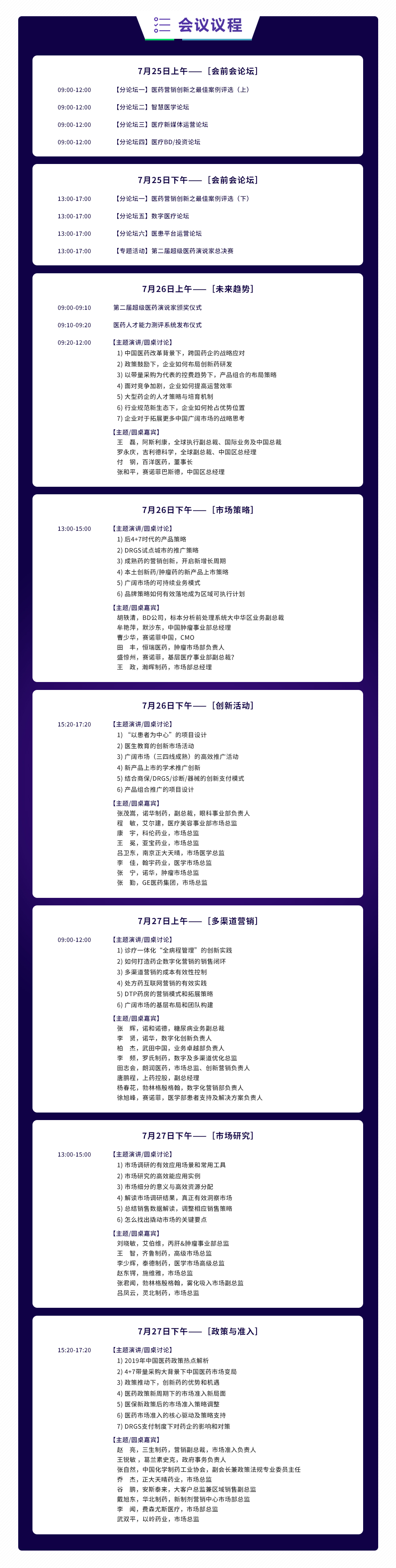 思齊將在7月低于上海召開2019醫(yī)療市場年會(第四屆),持續(xù)三天貢獻(xiàn)近百個主題內(nèi)容,兩天主會場包含了趨勢解讀、市場策略、創(chuàng)新活動、多渠道營銷、市場研究、政策與準(zhǔn)入等六大板塊,會前四大分會場設(shè)置了營銷案例評選、智慧醫(yī)學(xué)、新媒體運營、BD/投資、數(shù)字醫(yī)療、醫(yī)患平臺、醫(yī)藥演說家等七個論壇,以主題演講、圓桌分享、案例討論等形式聚焦“聚力賦能,洞見未來”!屆時將有100+頂級內(nèi)外資藥企高管,一起為各位行業(yè)人士分享交流。