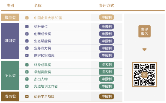 重點考察組織在戰(zhàn)略投資、系統(tǒng)儲備、培訓(xùn)運營、學(xué)習(xí)設(shè)計、效果評估、績效改進、品牌塑造、開拓創(chuàng)新、數(shù)字化運營等方面的建樹,表彰典范,樹立標桿。
