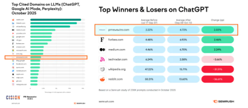再來看一個(gè)調(diào)查數(shù)據(jù):下圖是Semrush在去年10月份,基于23萬條真實(shí)的AI提問做的一項(xiàng)研究。他們統(tǒng)計(jì)了ChatGPT、Google Gemini最常引用的網(wǎng)站來源。而美通社的官網(wǎng)PRNewswire.com的排名在第14位,超過大量的我們傳統(tǒng)認(rèn)知中的知名網(wǎng)站與內(nèi)容平臺(tái)。