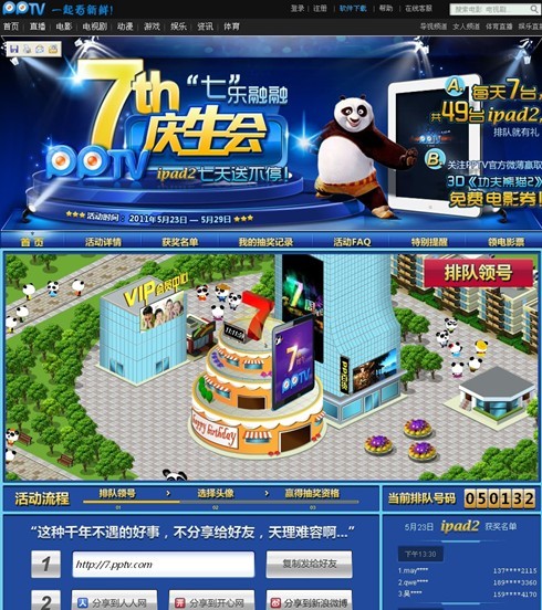 上海2011年5月24日電 /美通社亞洲/ -- 2011年5月23日零點,為感謝眾多忠實擁護者7年來的陪伴,PPTV 網(wǎng)絡(luò)電視七周年慶生送 iPad2 系列活動正式開始。截止活動第一天抽獎結(jié)束,PPTV 網(wǎng)絡(luò)電視7周年活動頁面用戶排隊次數(shù)已突破5萬,7臺 iPad2 大獎以及第一批的 3D《功夫熊貓2》電影券均發(fā)至用戶手中,目前該活動仍在火爆進行中。(活動網(wǎng)站:http://7.pptv.com)