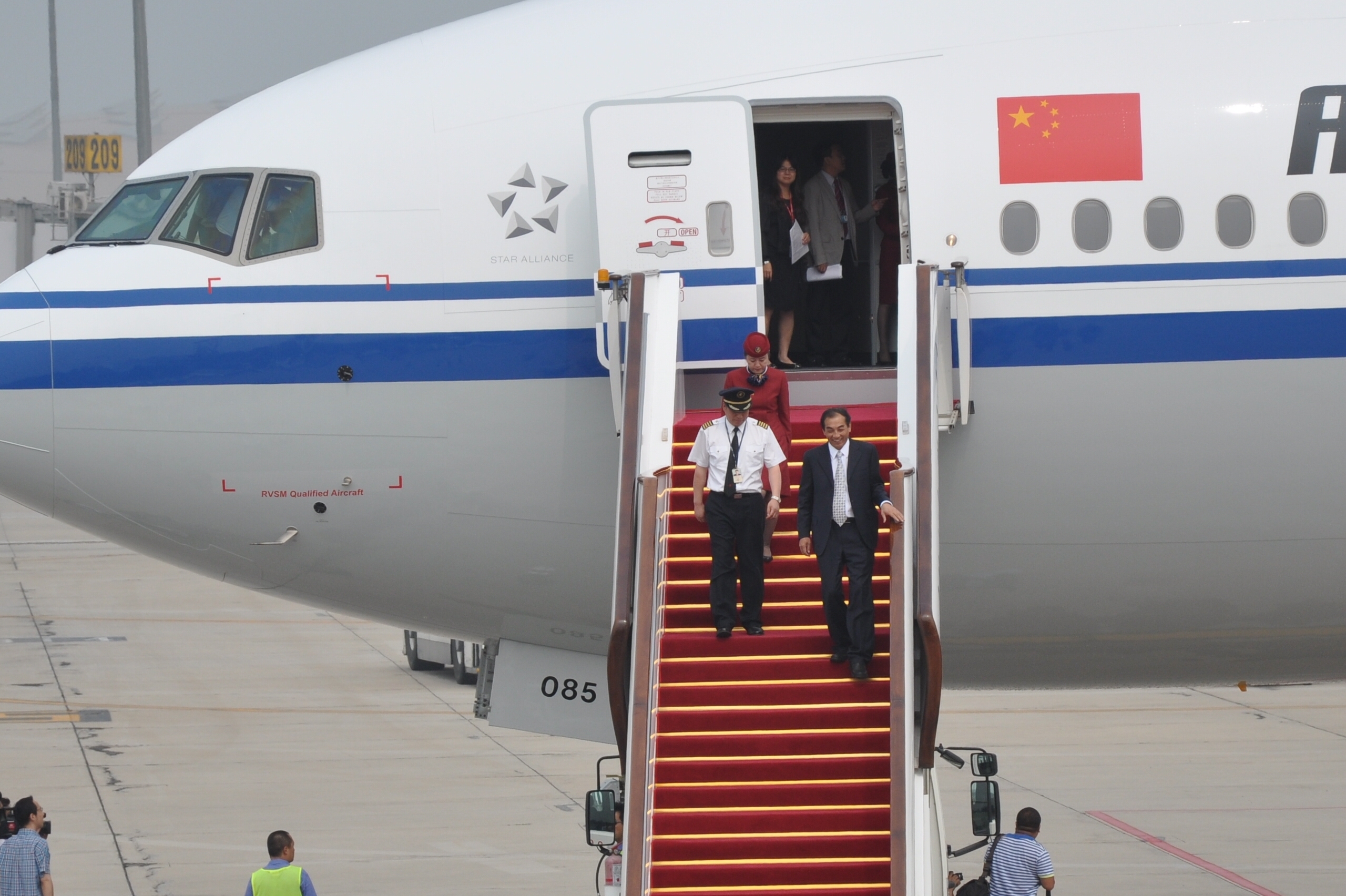 7月21日下午3時(shí),飛機(jī)抵達(dá)的同時(shí),國(guó)航在北京首都機(jī)場(chǎng)停機(jī)坪舉行了簡(jiǎn)單而熱烈的接機(jī)儀式。中航集團(tuán)總經(jīng)理、國(guó)航董事長(zhǎng)孔棟,中航集團(tuán)黨組書(shū)記、國(guó)航副董事長(zhǎng)王銀香,國(guó)航黨委書(shū)記樊澄,國(guó)航副總裁賀利、王明遠(yuǎn),國(guó)航黨委副書(shū)記馮潤(rùn)娥,國(guó)航總經(jīng)濟(jì)師許建強(qiáng)等出席儀式。首都機(jī)場(chǎng)股份公司總經(jīng)理張光輝等駐場(chǎng)單位代表和波音公司代表到場(chǎng)祝賀。藝術(shù)大師、國(guó)航標(biāo)志的主要設(shè)計(jì)者韓美林與首航機(jī)長(zhǎng)、乘務(wù)長(zhǎng)共同為飛機(jī)命名活動(dòng)揭匾。國(guó)航常旅客代表還在儀式上暢談了全程體驗(yàn)的美好感受。