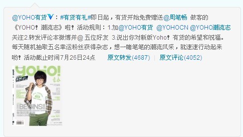 為了慶祝和宣傳 Begins 入駐 Yoho!有貨,早在7月20日,Yoho!有貨官方微博暨發(fā)起了轉(zhuǎn)發(fā)“Begins 入駐 Yoho!有貨,贈送周筆暢封面雜志《Yoho!潮流志》“活動。截止到今天共有4600多條轉(zhuǎn)發(fā),4000余條評論,加上此前發(fā)布的 Begins 正式入駐 Yoho!有貨新聞消息,共有5萬余人參與了微博的轉(zhuǎn)發(fā),評論量更是達到了3萬余條。沒想到粉絲們的力量是如此強大,正是借助于微博傳播,在周筆暢、Begins、Yoho 的貼吧粉絲們也是自覺將 Begins 的最新消息與其他筆迷們分享。