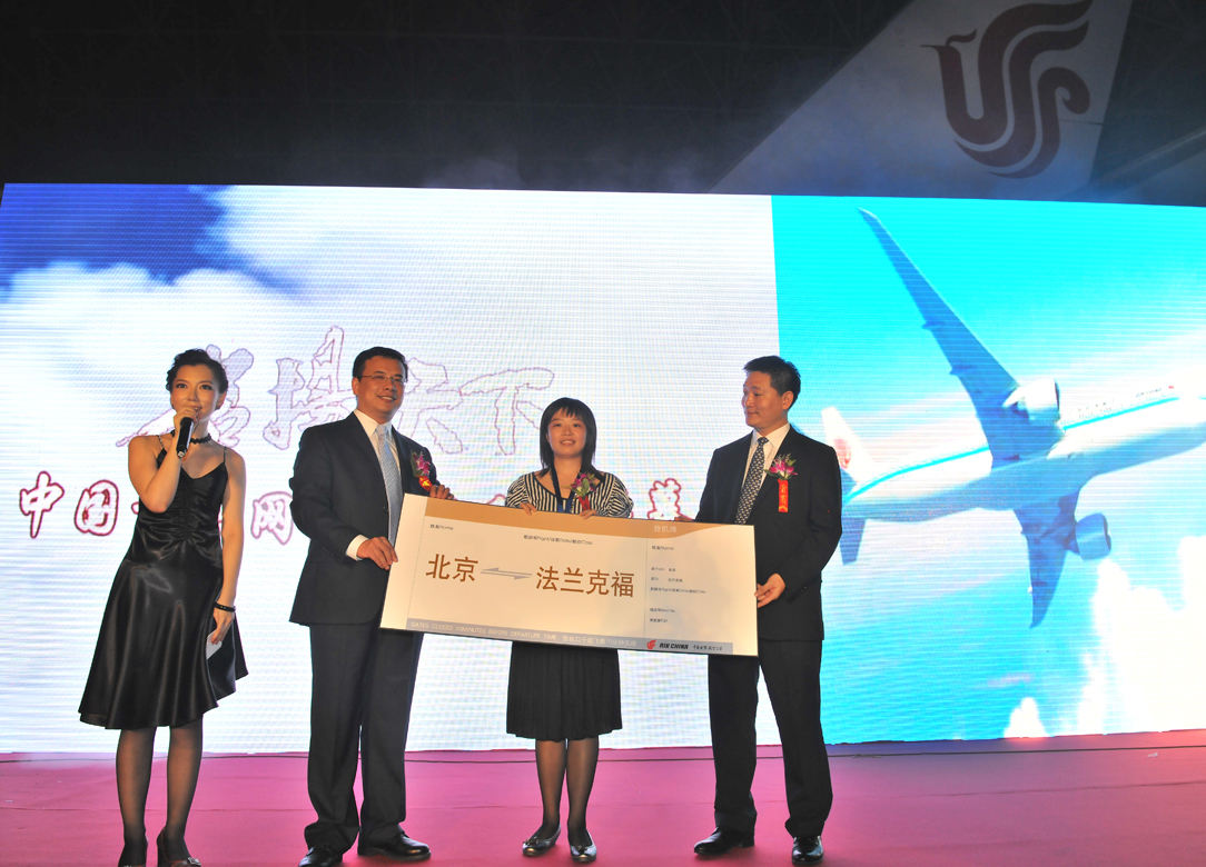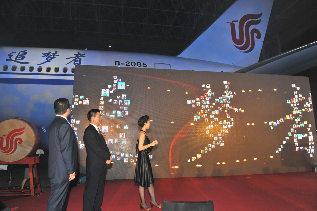 國航副總裁王明遠(yuǎn)與波音(中國)傳播事務(wù)副總裁王玉奎共同敲響揭幕鑼鼓。伴隨著全場倒計(jì)時(shí)、激動(dòng)人心的樂曲和絢爛燈光,懸掛在飛機(jī)機(jī)身的紅綢飄揚(yáng)而起,噴涂于飛機(jī)機(jī)身尾部,由300名國航微博粉絲頭像組成的“追夢者”三字赫然映入全場嘉賓眼簾,全場掌聲雷鳴。王明遠(yuǎn)親自向優(yōu)勝者頒發(fā)了命名活動(dòng)優(yōu)勝獎(jiǎng) -- 兩張北京至法蘭克福往返機(jī)票,而此架飛機(jī)也將于9月1日起,攜同已經(jīng)于8月投入運(yùn)營的另一架國航新引進(jìn)的 B777-300ER 飛機(jī)共同執(zhí)行北京至法蘭克福航線?;顒?dòng)現(xiàn)場,國航還特意安排與會(huì)嘉賓登機(jī)體驗(yàn),并品嘗頭等艙、公務(wù)艙餐食和美酒。網(wǎng)友們也在現(xiàn)場弦樂隊(duì)的美妙樂曲中與自己命名的飛機(jī)共度了一個(gè)輕松美好的夜晚。