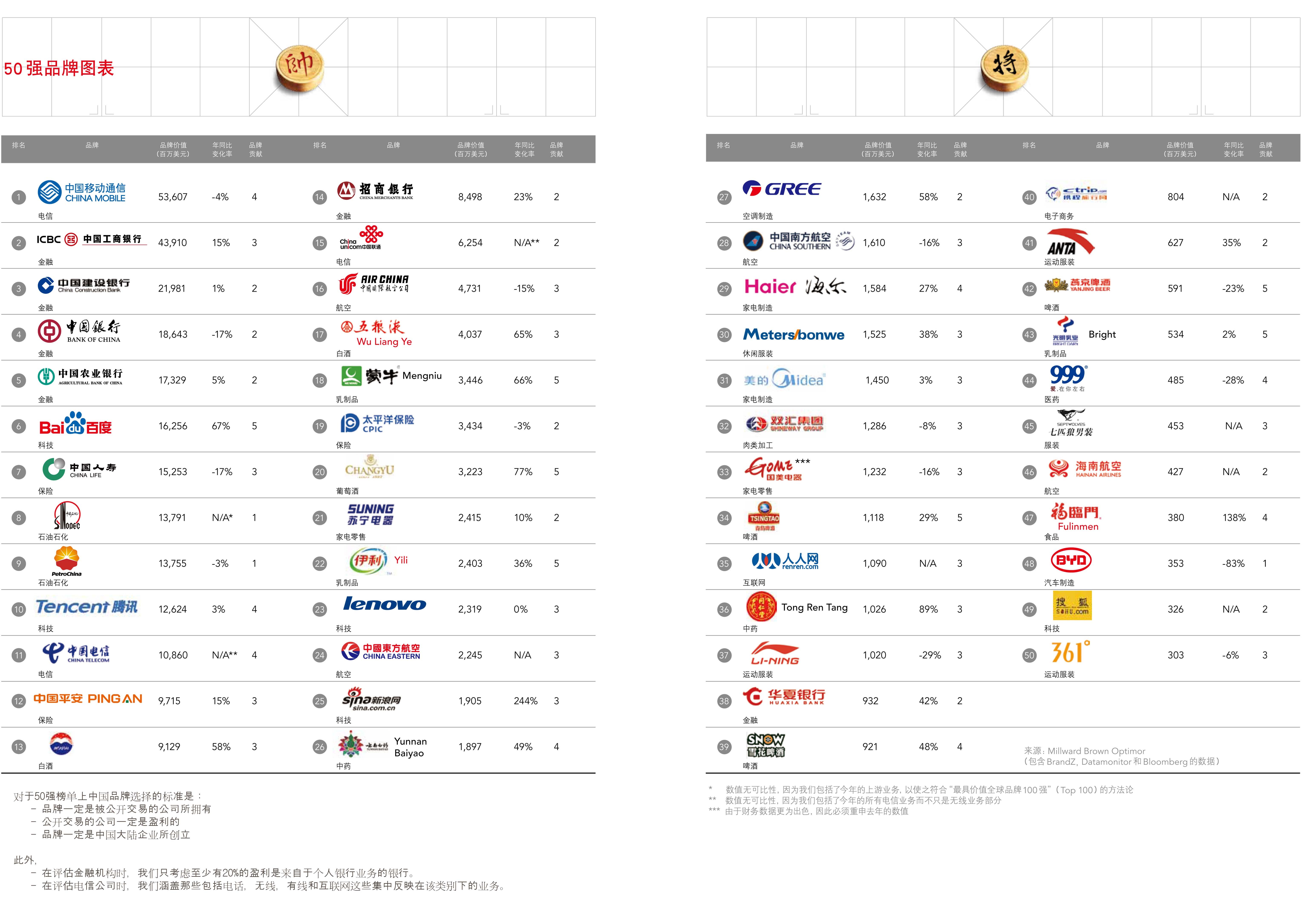 BrandZ? 最具價(jià)值中國(guó)品牌50強(qiáng)排行榜是由 Millward Brown 公司為 WPP 旗下運(yùn)營(yíng)公司執(zhí)行的研究項(xiàng)目。此項(xiàng)目是唯一結(jié)合了數(shù)據(jù)超過35,000名中國(guó)消費(fèi)者的調(diào)查的品牌資產(chǎn)與對(duì)每家公司的財(cái)務(wù)及經(jīng)營(yíng)成果的嚴(yán)格分析(數(shù)據(jù)來自 Bloomberg 和 KantarWorldpanel)的研究調(diào)查,分隔品牌在推動(dòng)品牌業(yè)務(wù)收入及資本市場(chǎng)的價(jià)值。