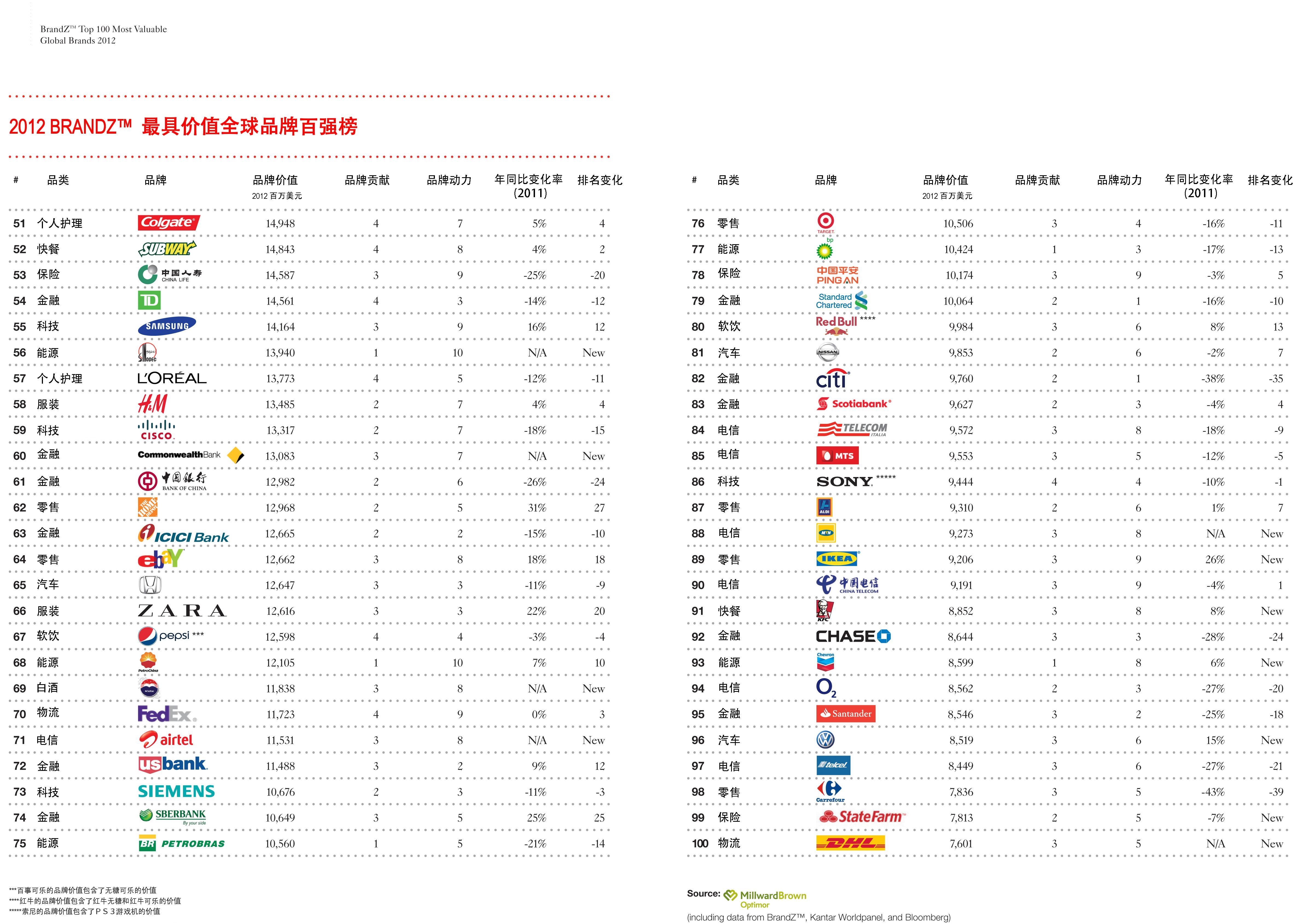 BrandZ 最具價值全球品牌百強(qiáng)調(diào)查不僅對財務(wù)數(shù)據(jù)、市場估價、分析報告和風(fēng)險預(yù)測進(jìn)行了縝密的分析,而且還考慮了消費(fèi)者的意見,這在全世界可謂絕無僅有。調(diào)查報告在互聯(lián)網(wǎng)上發(fā)布,內(nèi)容包括全球主要地區(qū)和 13 個市場領(lǐng)域的最具價值品牌排名結(jié)果及分析。單擊此處下載完整的 BrandZ 排行榜,其中包括地區(qū)和類別細(xì)分排名。排行榜及其他相關(guān)信息還通過免費(fèi)的蘋果及安卓交互式應(yīng)用程序或iPad 雜志提供。