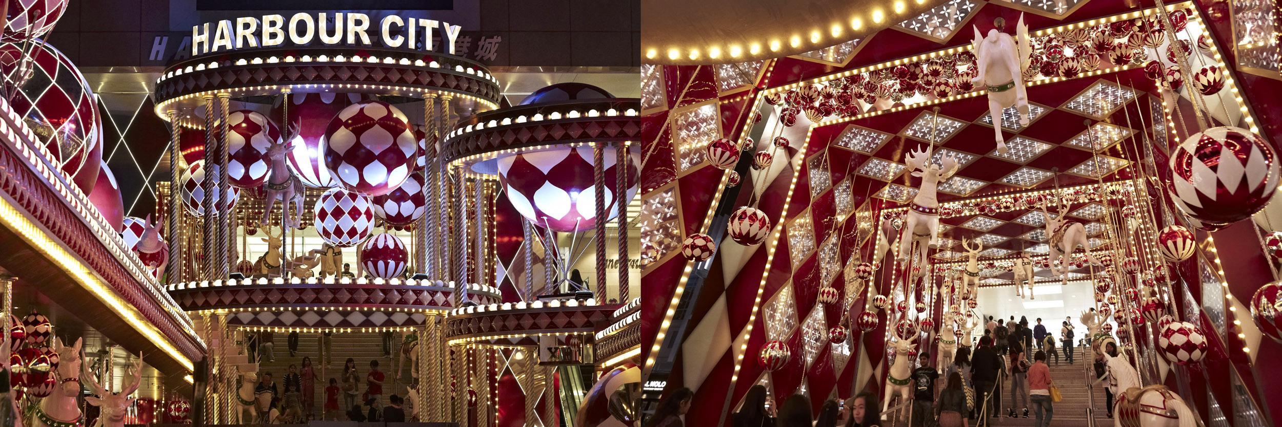 海港城今年的圣誕主題為“圓滿愛”,海港城海運(yùn)大廈露天廣場的圣誕布置以“旋轉(zhuǎn)木馬”和“夢幻馬戲團(tuán)”為設(shè)計概念。整個裝飾長達(dá)50米,從五枝旗桿伸廷至海港城海運(yùn)大廈正門入口,并首次把廣場兩旁全面布置。