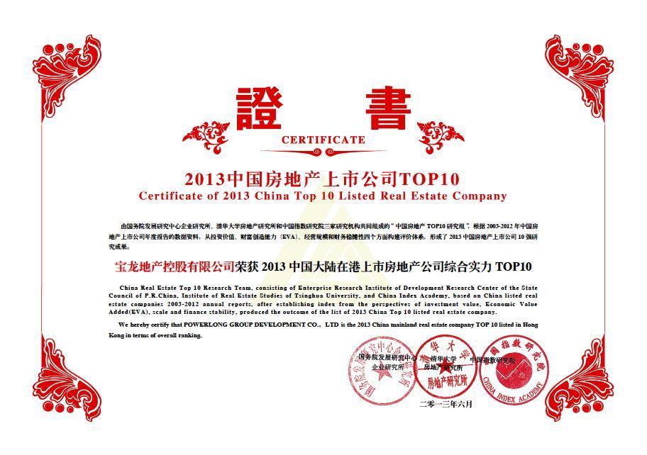 上海2013年5月31日電 /美通社/ -- 2013年5月31日,2013中國(guó)房地產(chǎn)上市公司研究成果發(fā)布會(huì)暨第十一屆中國(guó)房地產(chǎn)投融資大會(huì)在中國(guó)證券監(jiān)督管理委員會(huì)北京會(huì)議廳盛大召開。寶龍地產(chǎn)(HK.1238)再次獲得“2013大陸在港上市房地產(chǎn)公司綜合實(shí)力十強(qiáng)”、 “2013中國(guó)大陸在港上市房地產(chǎn)公司財(cái)務(wù)穩(wěn)健性十強(qiáng)”兩大獎(jiǎng)項(xiàng)。