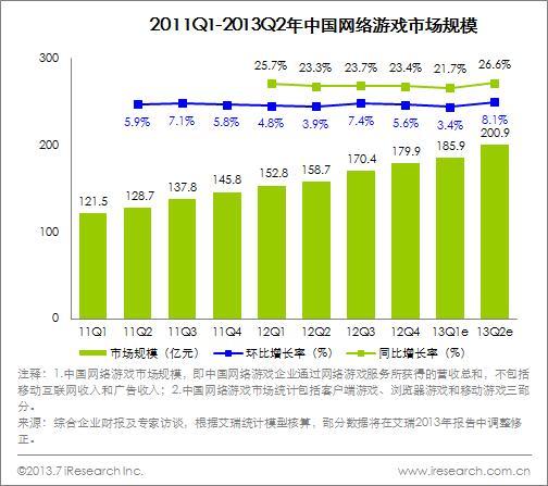 總結(jié):2013Q2網(wǎng)絡(luò)游戲依托移動(dòng)游戲和網(wǎng)頁(yè)游戲的快速擴(kuò)張,市場(chǎng)規(guī)模不斷增加,尤其今年是移動(dòng)游戲如火如荼來(lái)勢(shì)洶洶的一年。