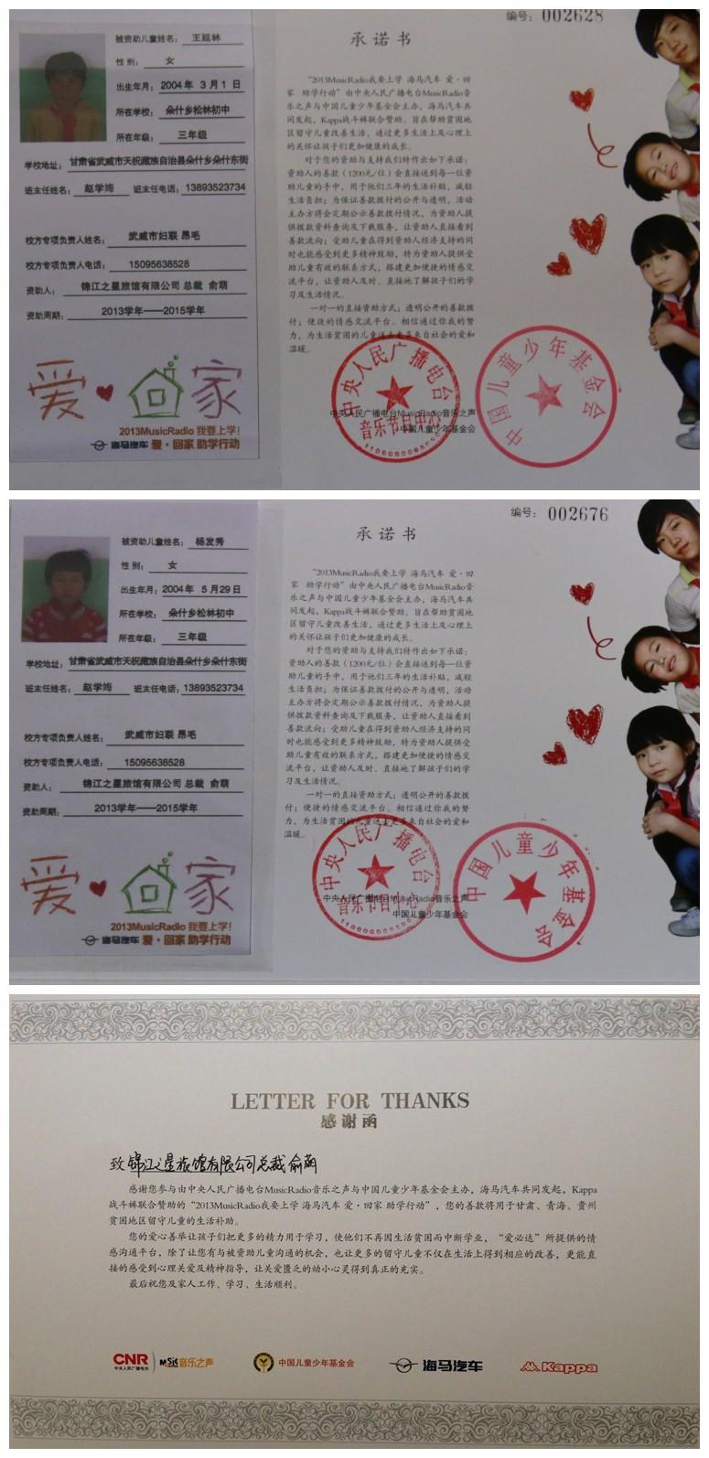 2013年10月,錦江之星主動(dòng)參與中央人民廣播電臺(tái)music radio 音樂之聲與中國(guó)兒童少年基金會(huì)主辦的“2013 music radio 我要上學(xué)的主題活動(dòng)”,為甘肅、青海、貴州貧困地區(qū)的留守兒童提供一對(duì)一的生活補(bǔ)助、心理關(guān)愛和精神指導(dǎo)。錦江之星CEO俞萌先生以個(gè)人名義資助了兩名甘肅的留守兒童,為這兩名小學(xué)生分別提供3年的經(jīng)濟(jì)支持和心理關(guān)愛。