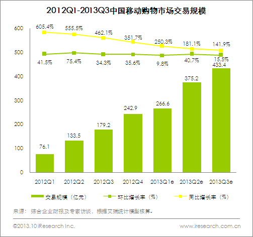 2013Q3移動(dòng)購物市場(chǎng)規(guī)模433.4億元,保持高速增長(zhǎng)